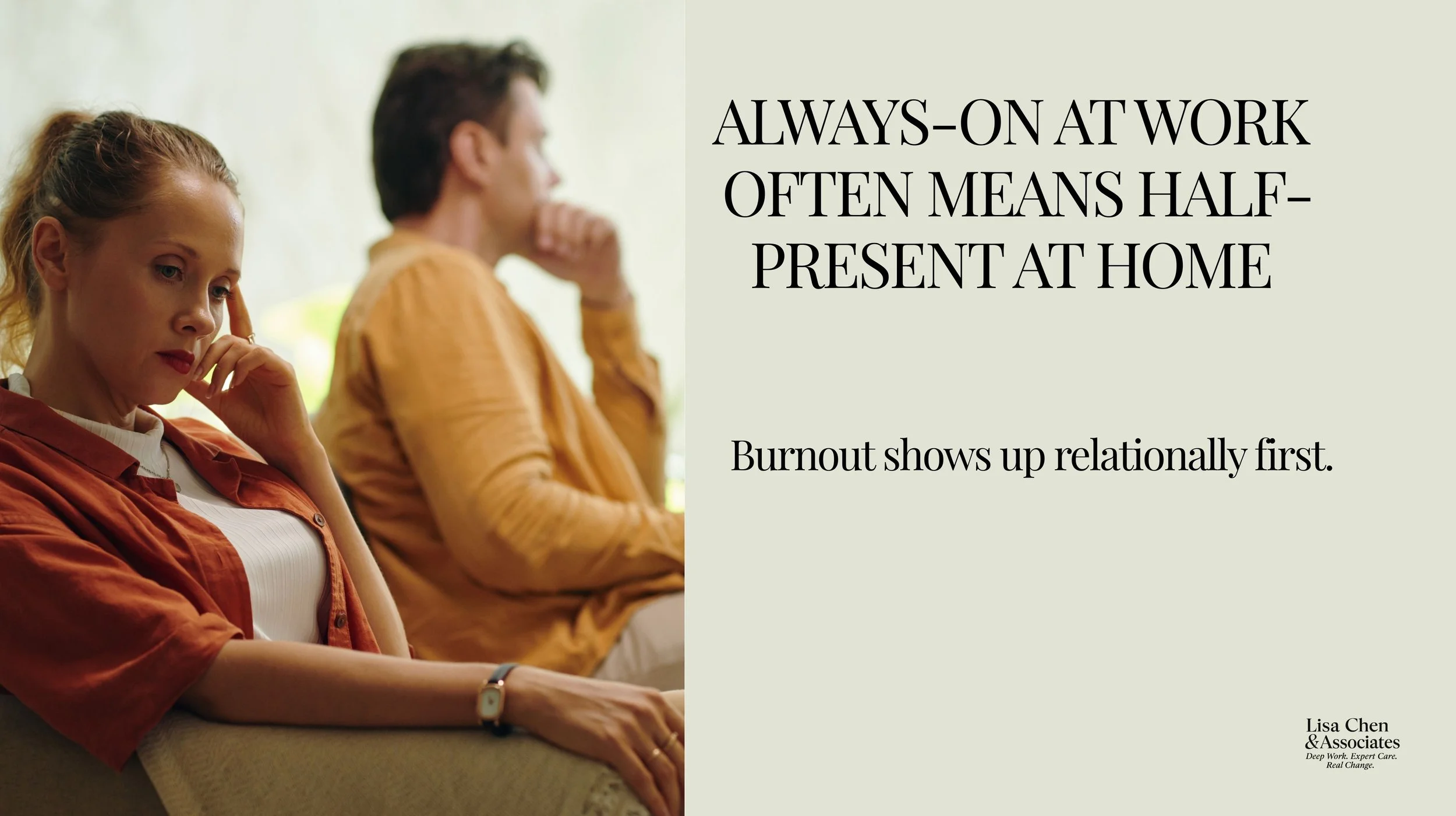 At Lisa Chen & Associates Therapy in Hermosa Beach, we work with high-performing professionals across the South Bay who want to sustain success without sacrificing their health or family life.
