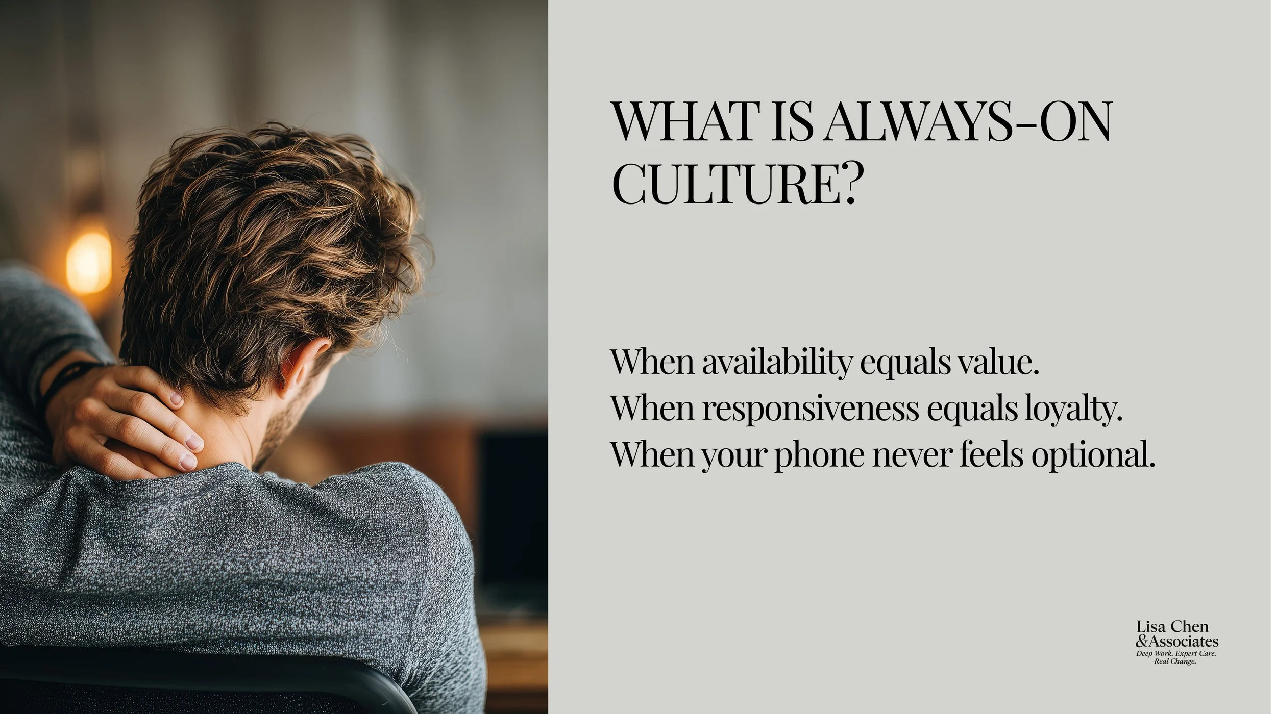 Many high achievers in demanding roles feel trapped in always-on culture — where responsiveness equals value and availability justifies compensation.