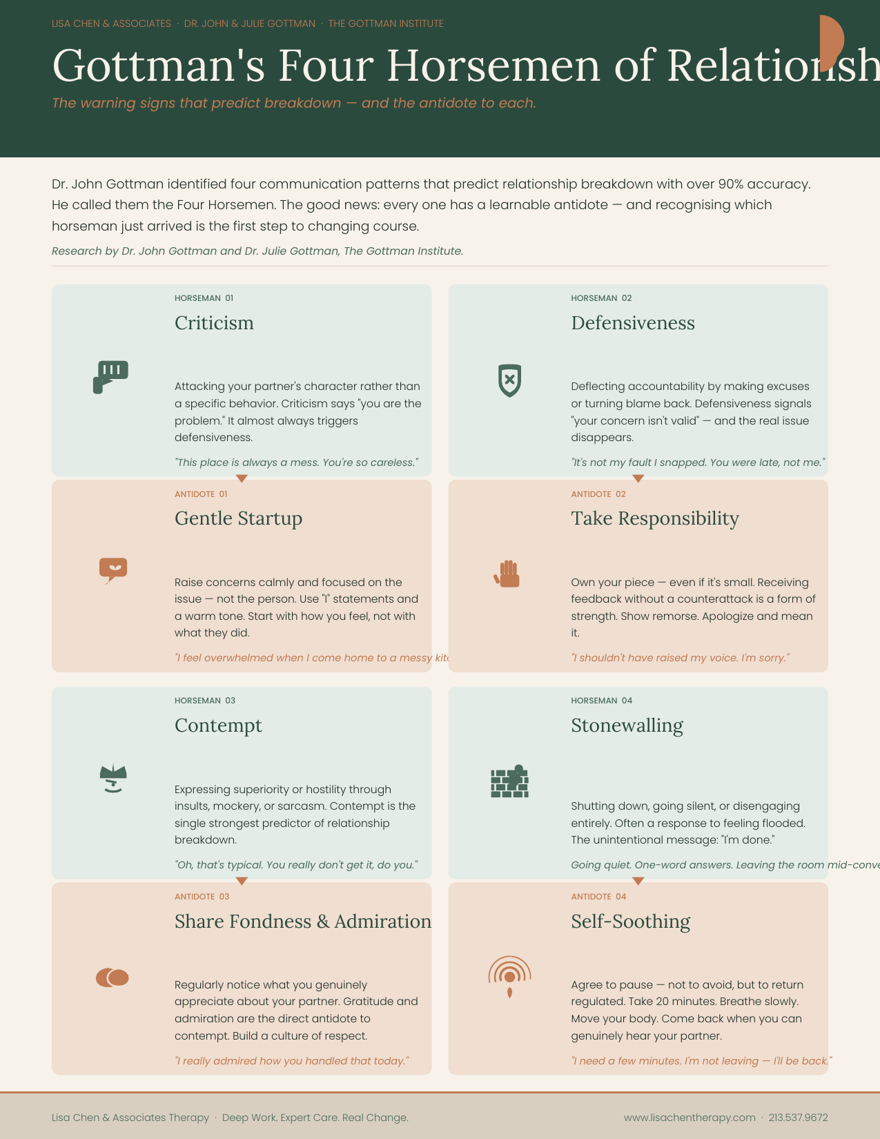 Inside, you’ll learn how each of the Four Horsemen shows up in everyday conversations. How criticism turns into character attacks, how defensiveness blocks repair, why contempt damages trust, and how stonewalling is often overwhelm, not indifference.