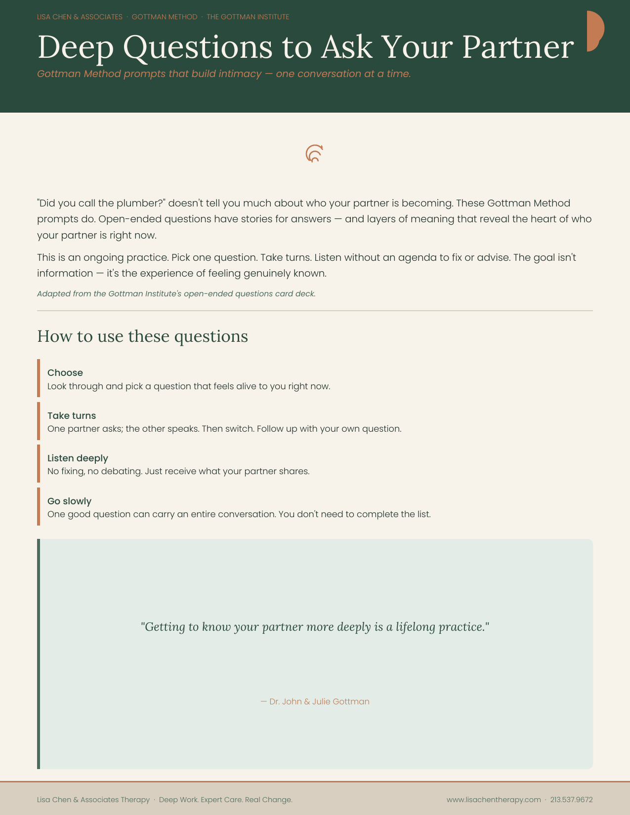 Gottman Method prompts that build intimacy, one conversation at a time. 41 open-ended questions that go far beyond the surface — for couples who want to keep truly knowing each other.