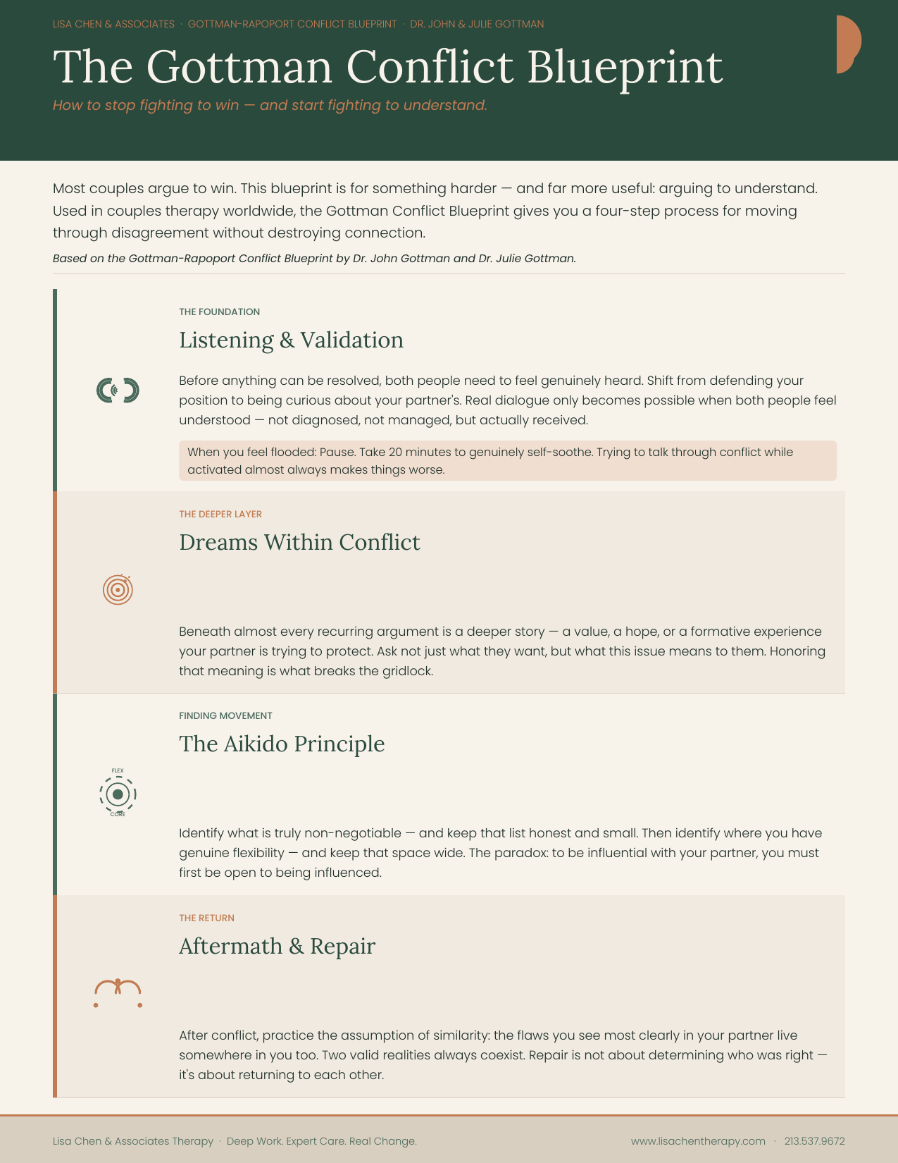 A four-step framework for moving through disagreement without destroying connection. Most couples argue to win — this teaches you how to argue to understand.