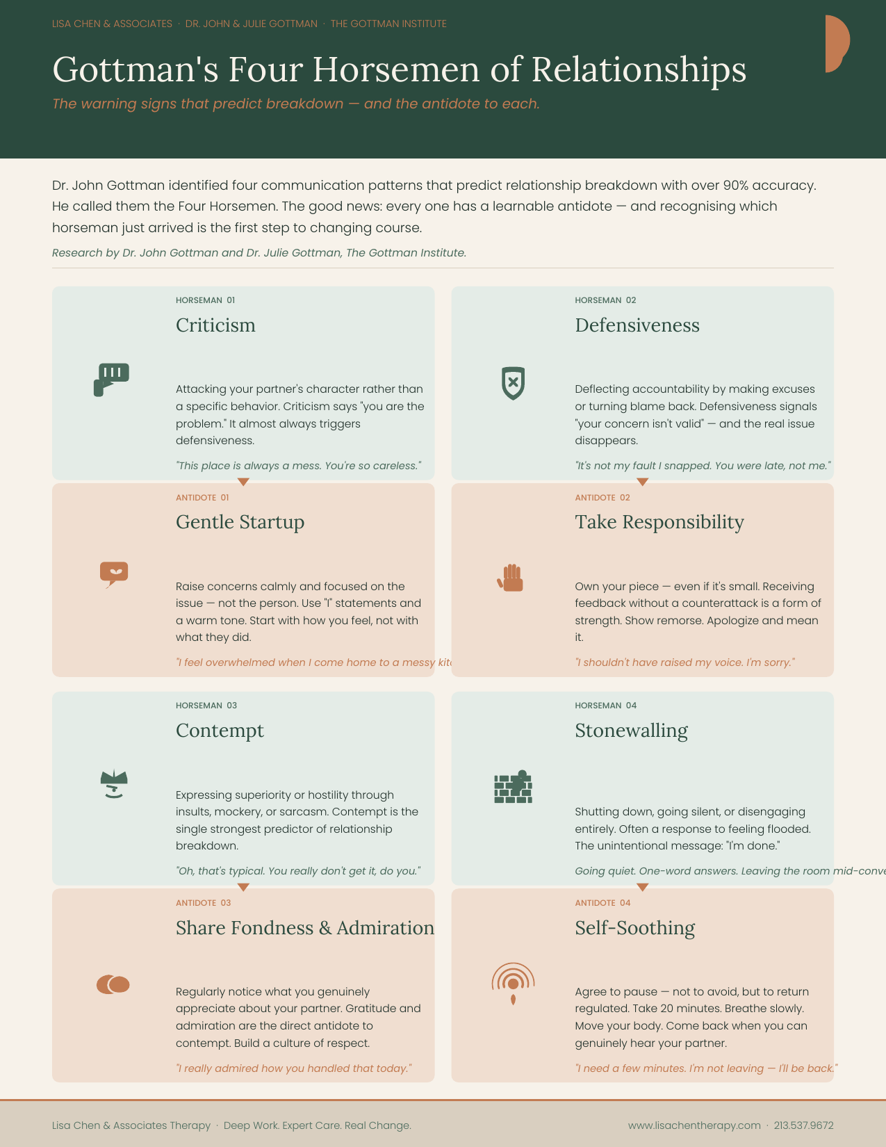 The four communication patterns that predict relationship breakdown — and the antidote to each. Dr. John Gottman's most cited research, distilled into a practical reference you can use.