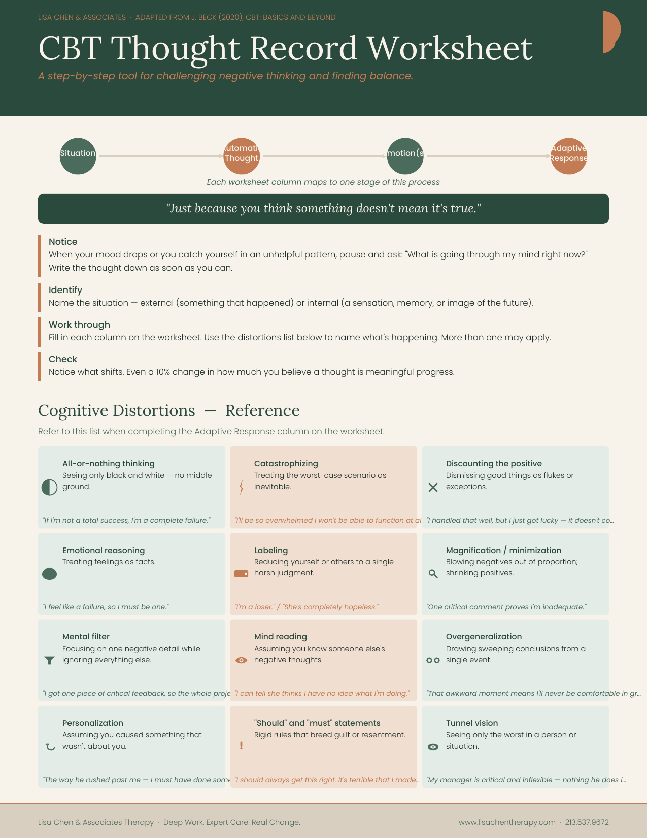 A step-by-step cognitive behavioral therapy tool for examining negative thoughts and finding a more balanced perspective. Used by therapists worldwide , now available to work through on your own.